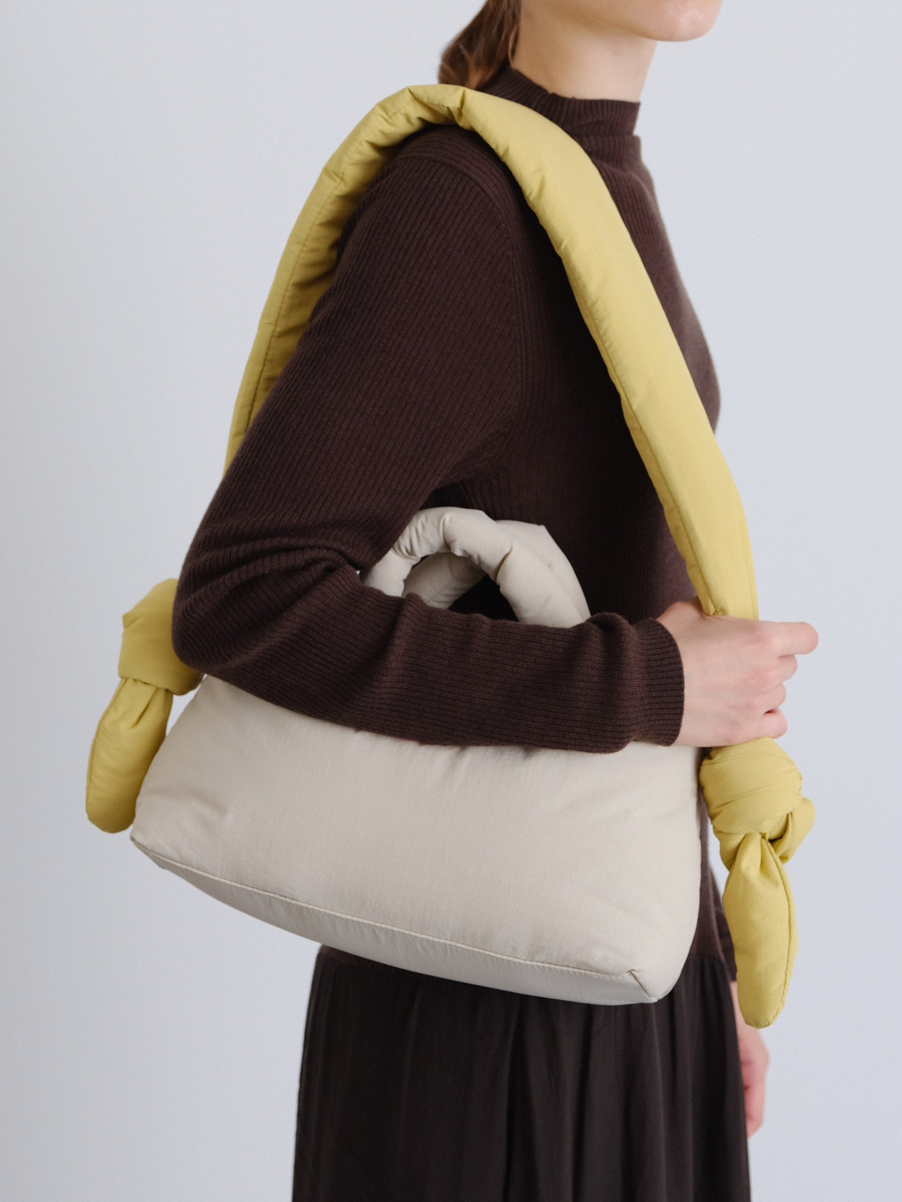 The Dumpling Bag can be worn in multiple ways: as a pouch, crossbody bag, or shoulder bag by either adjusting or removing the strap. This versatility expands its range of use and thereby optimizes its lifespan. This "3 in 1" functionality aligns with responsible and sustainable consumption by reducing the need for multiple bags for different occasions.