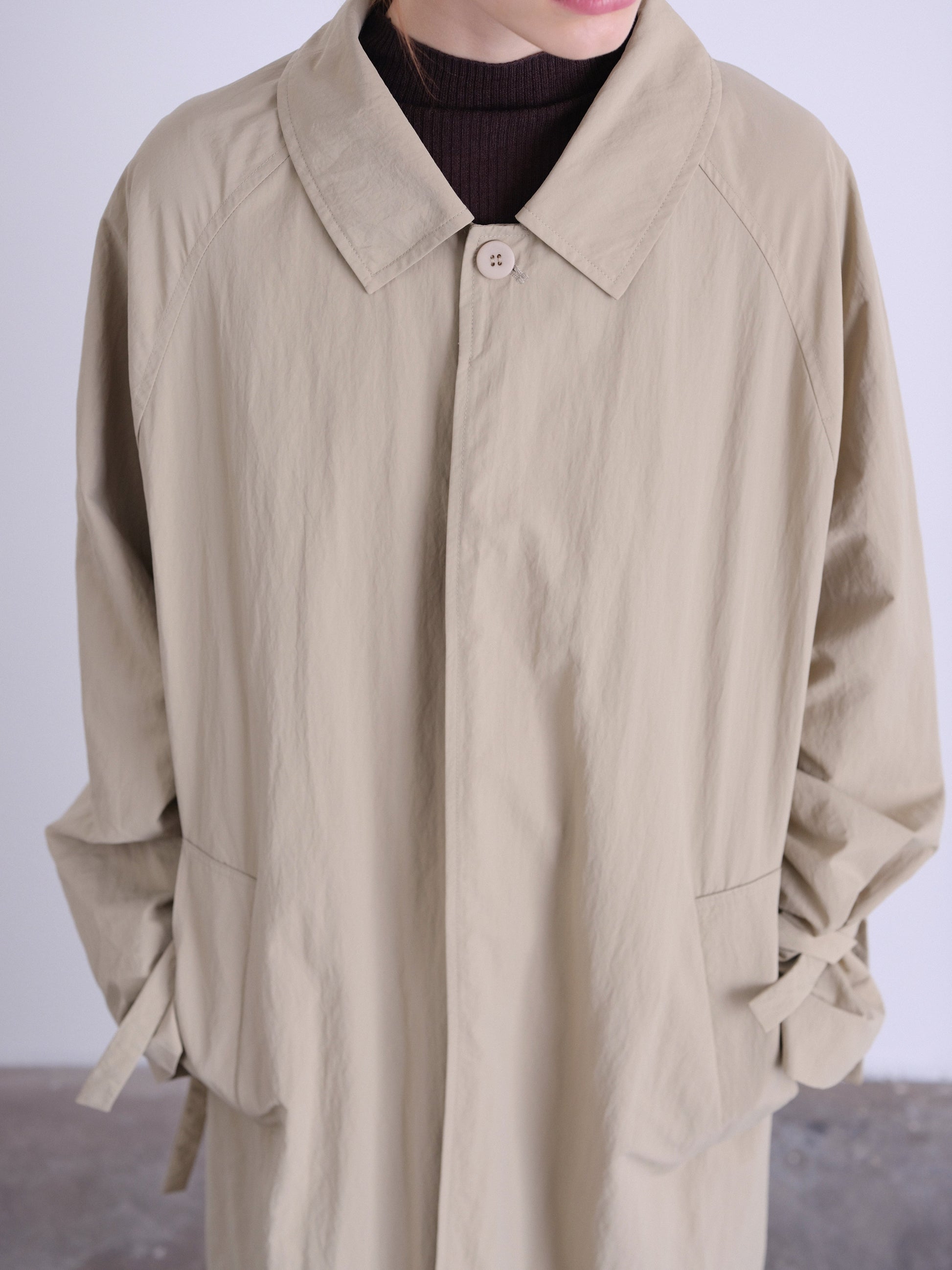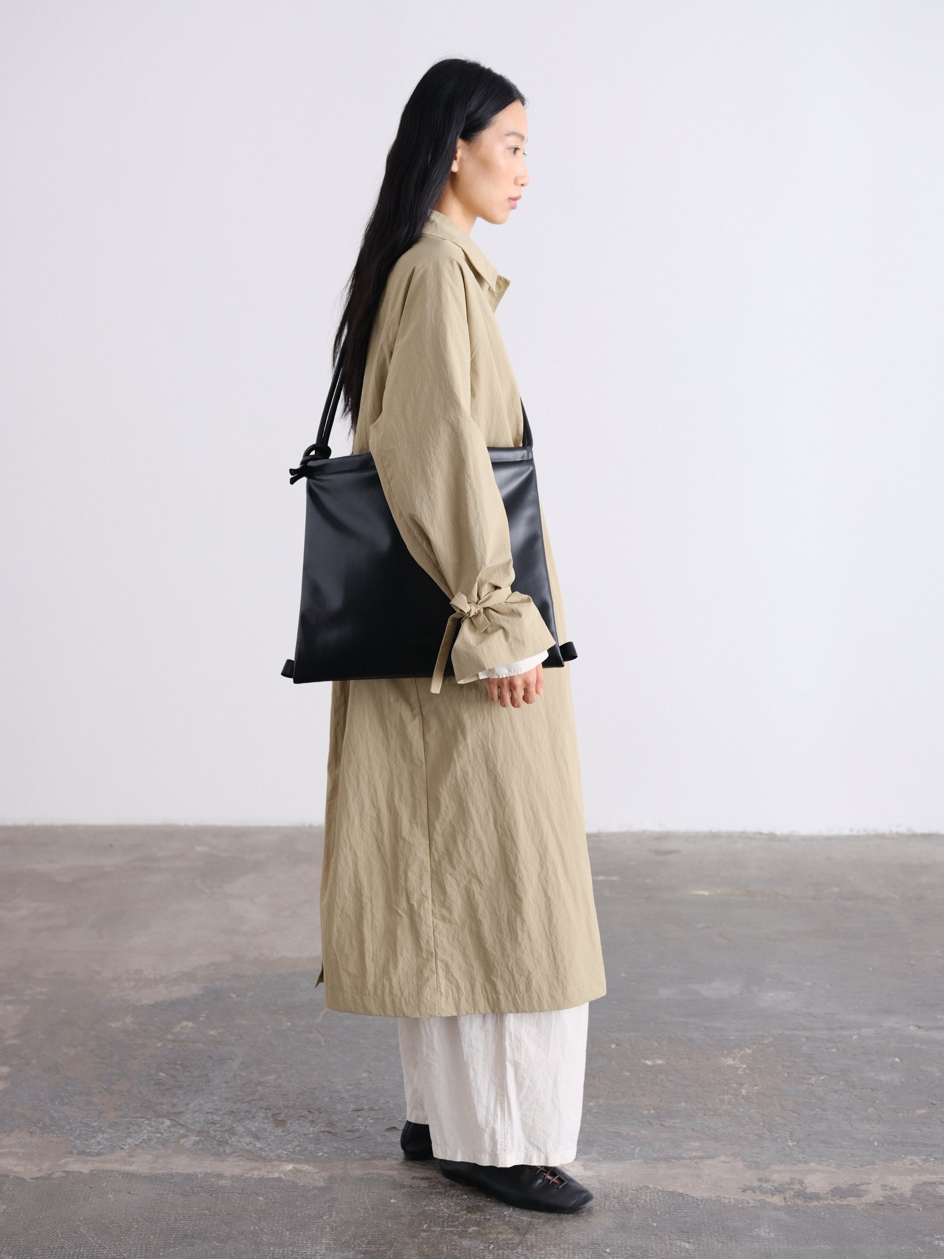 At the cuffs, slender ties offer a subtle gesture, to knot into delicate bows or let fall loose, a subtle detail that transforms the piece with ease.